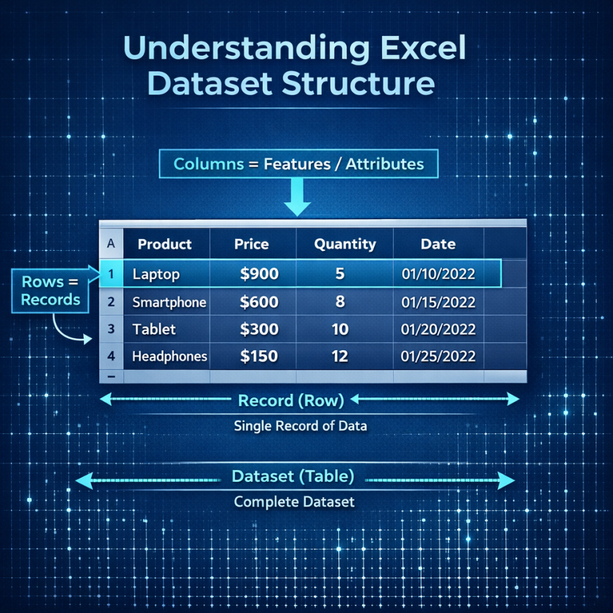 Excel organizes data in a table format made up of rows and columns. This structure is very similar to how datasets are organized in databases, analytics tools, and machine learning systems.