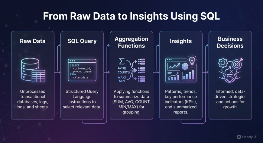 Learn SQL aggregation functions like COUNT, SUM, AVG, and GROUP BY to analyze data and generate insights. Beginner friendly SQL guide by Neody IT for aspiring data analysts.