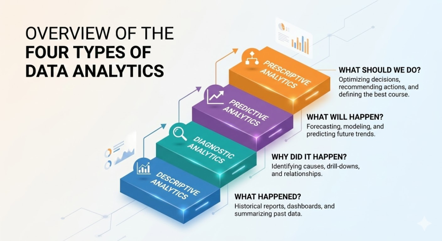 To understand how analytics works in the real world, it is important to learn the four major types of data analytics. Each type answers a different question and plays a unique role in decision making.